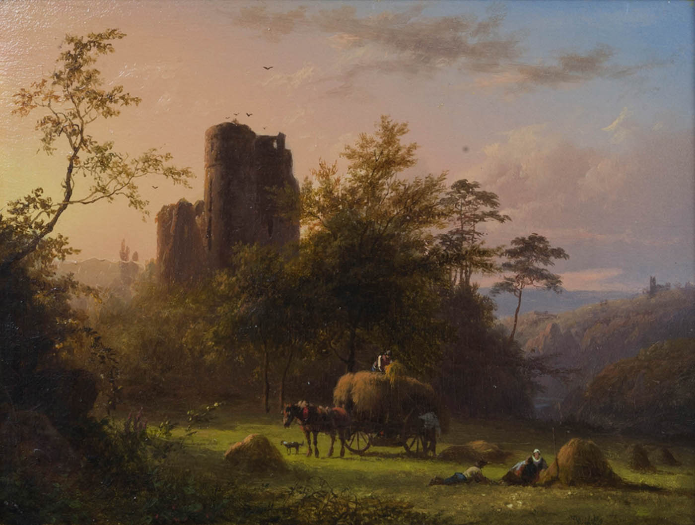 In der Beherrschung sowohl des großen als auch kleinen Formates steckt die Meisterschaft des Künstlers: Das mit seinem miniaturhaft kleinen Format charmantere, den unmittelbaren, sicheren und doch zarten Pinselstrich offenbarende Gemälde, zeigt eine ähnliche Figurenszene wie das zugrundeliegende Vorbild. Eine Bauerngruppe lagert auf abgemähter, baumbestandener Wiese vor einem beladenen und angespannten Heuwagen. Die Stunde der Rast ist in das warme Licht und die Farben eines nahenden Abends getaucht. Die idyllische Szene der Ruhe nach getaner Arbeit wird von einer Burgruine im Hintergrund überragt. Sie ist Sinnbild für die Vergänglichkeit menschlicher Zivilisation im ewigen Kreislauf der Natur. Auch das Motiv der Heuernte taucht im Werk B.C. Koekkoeks häufiger auf. Es steht in der Tradition der niederländischen Malerei des 17. Jahrhunderts: Es bildet die Landbevölkerung mit ihrer als naturnah empfunden Lebenswirklichkeit im Gegensatz zum städtischen Leben ab.