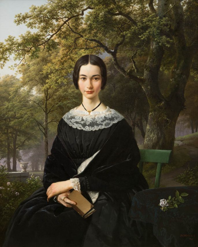 Das Gemälde ist neben dem mutmaßlichen Bildnis seiner Mutter Anna van Koolwijk aus dem Jahr 1827 (ebenfalls in der Sammlung des B.C. Koekkoek-Hauses) das einzige bekannte in Öl gemalte Porträt des Meisters. Es zeigt eine junge sitzende Frau, vornehm in Witwentracht gekleidet in schwarzem Biedermeierkleid mit weißem Spitzenkragen und schwarzer Samtstola. Sie sitzt auf einem grünen Gartenstuhl vor einer Parklandschaft. In den Händen hält die junge Dame ein Buch, die Finger der rechten Hand markieren die Stelle, an der sie gerade gelesen hat. Eine rosafarbene Rose ist auf einem mit schwarzem Tischtuch bedeckten Tisch neben ihr abgelegt. Ein Rosenstock, von dem die Rose zu stammen scheint, ist links vor einer Gartenarchitektur zu sehen.