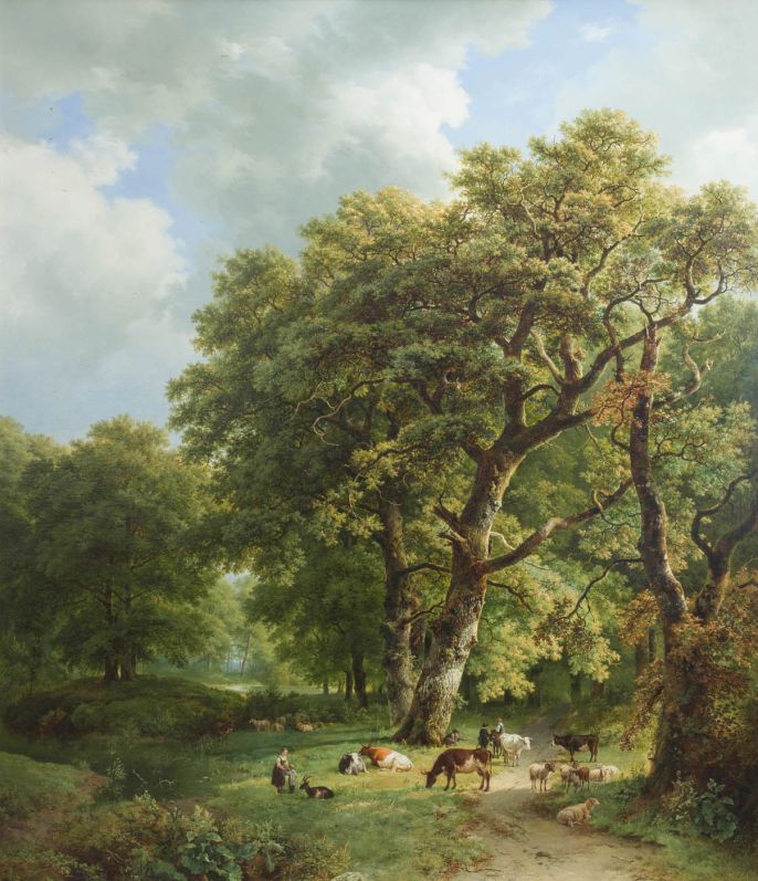 Das Gemälde ist in Komposition und Ausführung ein Meisterwerk. In einer hellen, vom Sonnenlicht durchströmten Waldgegend an einem Wasserlauf führt auf einem breiten Weg Landvolk eine kleine Herde mit Rindern, Schafen und Ziegen zum Äsen und Tränken aus. Diese sogenannte „Staffage“ mit Tier und Mensch im Mittelgrund ist vom Künstler durch die Licht- und Wegeführung in Szene gesetzt. Der von rechts außerhalb des Bildraumes in die Mitte führende Weg lässt eine größere lichtdurchflutete Lichtung erahnen. Mensch und Tier sind liebevoll erzählerisch ausgeführt: links beugt sich eine Mutter zu ihrem Kleinkind, rechts im Hintergrund assistiert ein Mann einer Eselreiterin. Eine weitere Lichtinsel in linken Hintergrund der Komposition führt das Auge des Betrachters in die räumliche Tiefe.
