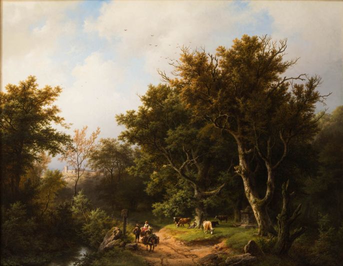 Typisch für die Koekkoek`sche Komposition ist die lichtbeschienene Szene in der Mitte des Bildaufbaus, der Gegensatz zwischen den monumentalen Baumriesen und der klein wirkenden Figurenstaffage.