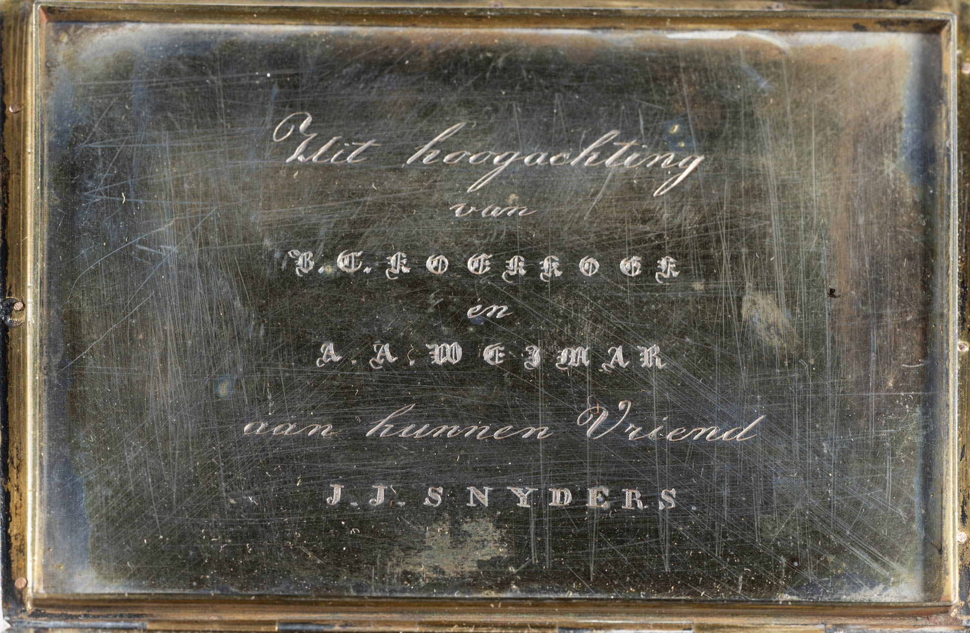 Gravierte Widmung im Inneren des Deckels: Uit hochachting van B.C. Koekkoek en A.A. Weimar aan hunnen vriend J.J. Snyders
