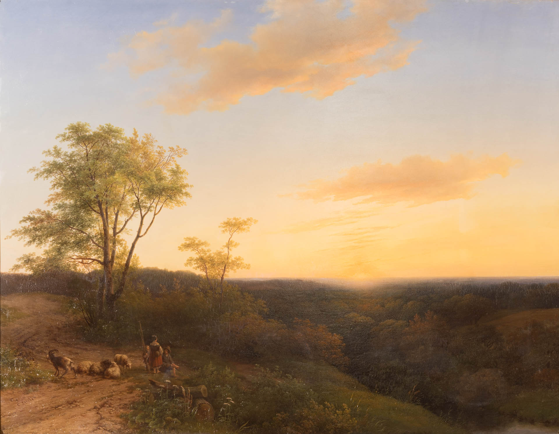 Das Gemälde des Haarlemer Landschaftsmalers zeigt den Wald um Schloss Moyland mit den fast unscheinbar in einem Meer aus Baumgipfeln verschwindenden Türmen der Wasserburg. Der Hauptturm trägt noch den barocken Helm. Erst in den 1860er Jahren wird das Schloss umgebaut. Der im Vordergrund links verlaufende Sandweg ist mit einem Hirtenpaar mit ihrer kleinen Schafherde belebt. Die Szenerie ist von einem hohen Himmel mit einer im Gegenlicht leuchtenden Abendsonne beherrscht. Sie taucht die Landschaft in warmes Licht.