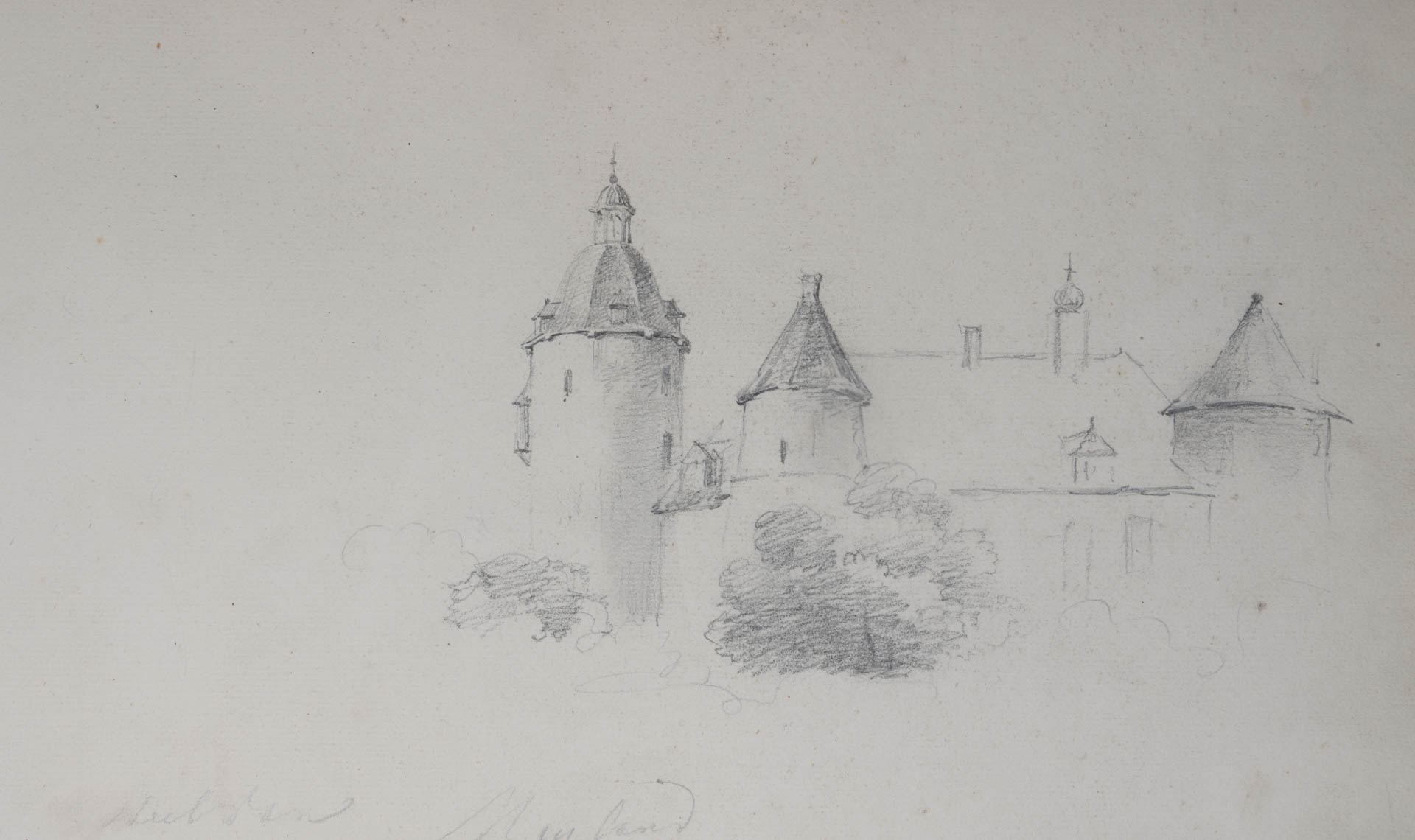 Waldlandschaft mit den Türmen von Schloss Moyland, nach 1840