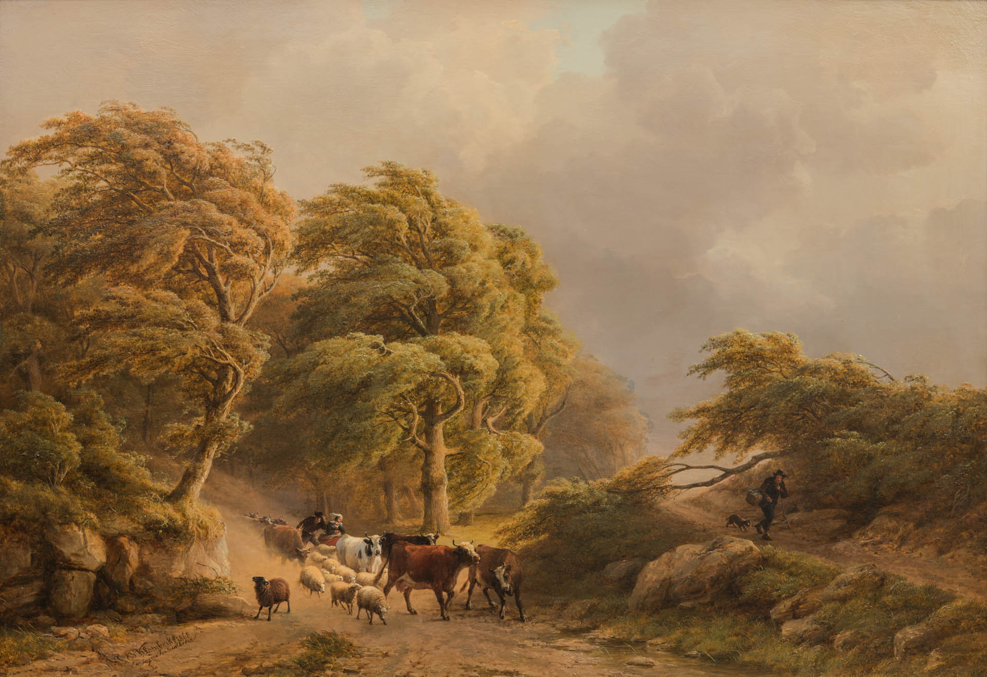 Das Gemälde ist ein Beispiel für eine in der Klever Romantik übliche Gemeinschaftsarbeit zweier Künstler. Die Landschaft stammt von Klombeck, die Tierstaffage von Verboeckhoven.