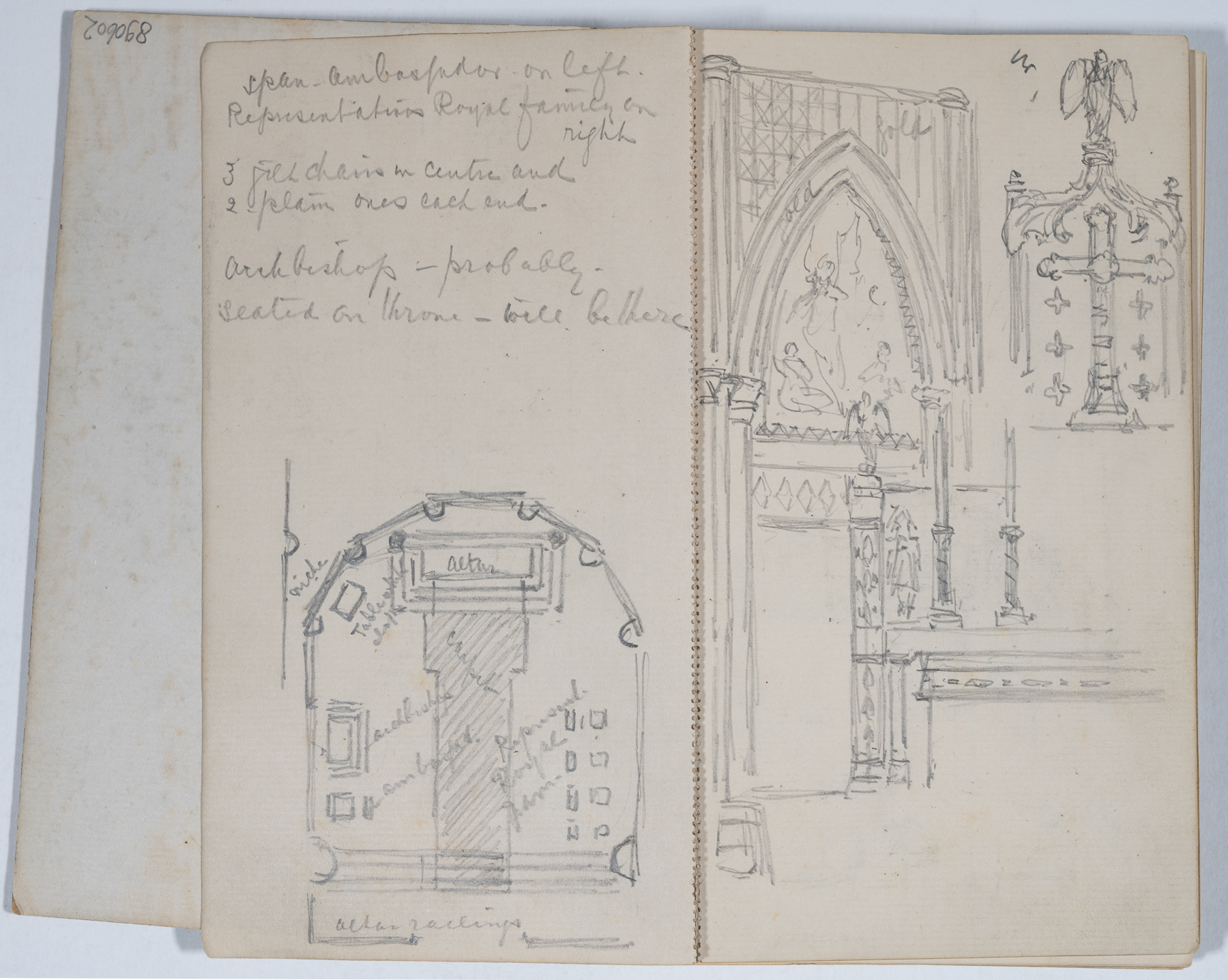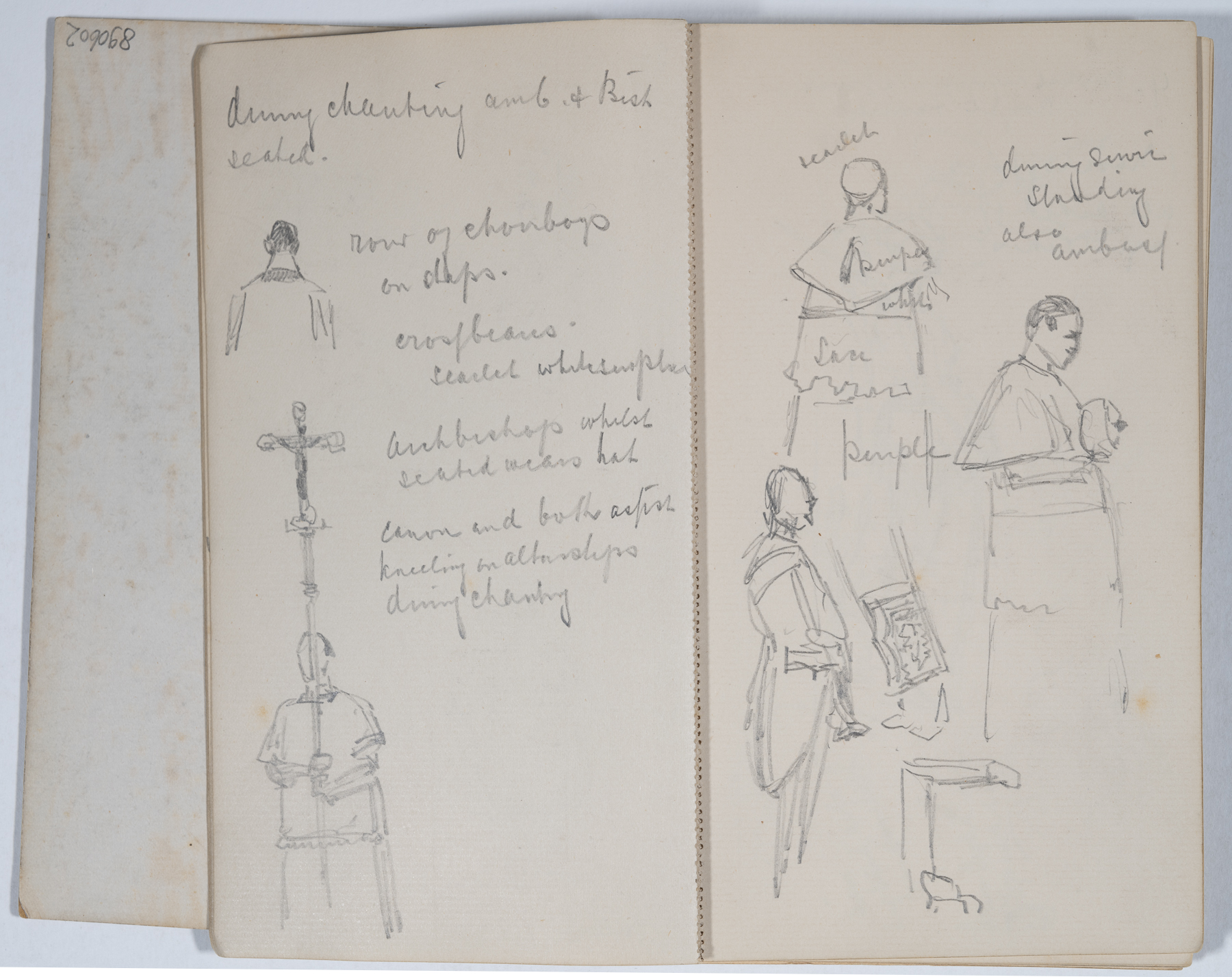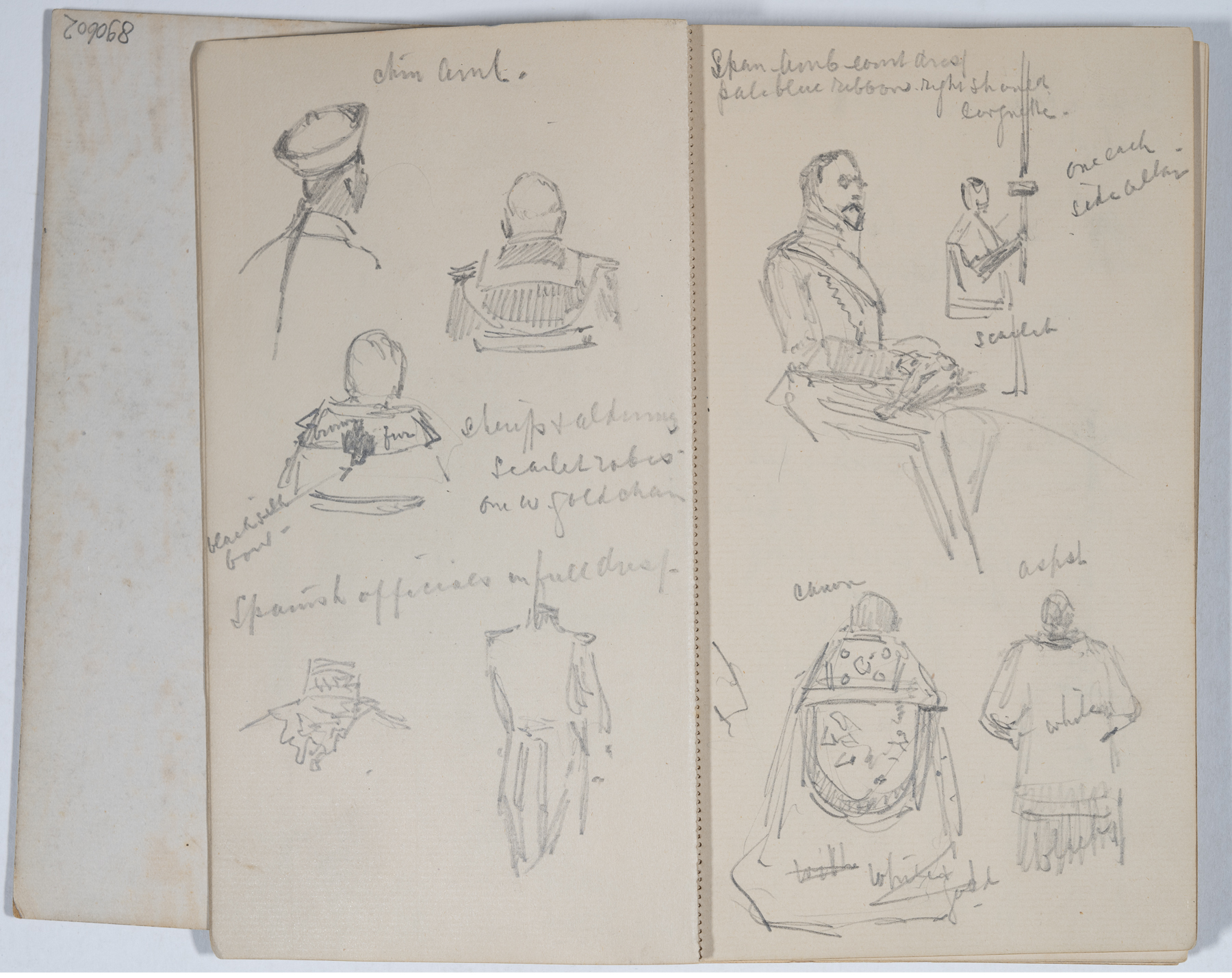 Motive: Architektur (London St. Paul’s Cathedral), Figuren, Soldaten, Pferde, Heerlager, Hafenszenen, orientalische Skizzen, viele handschriftliche Notizen in englischer Sprache