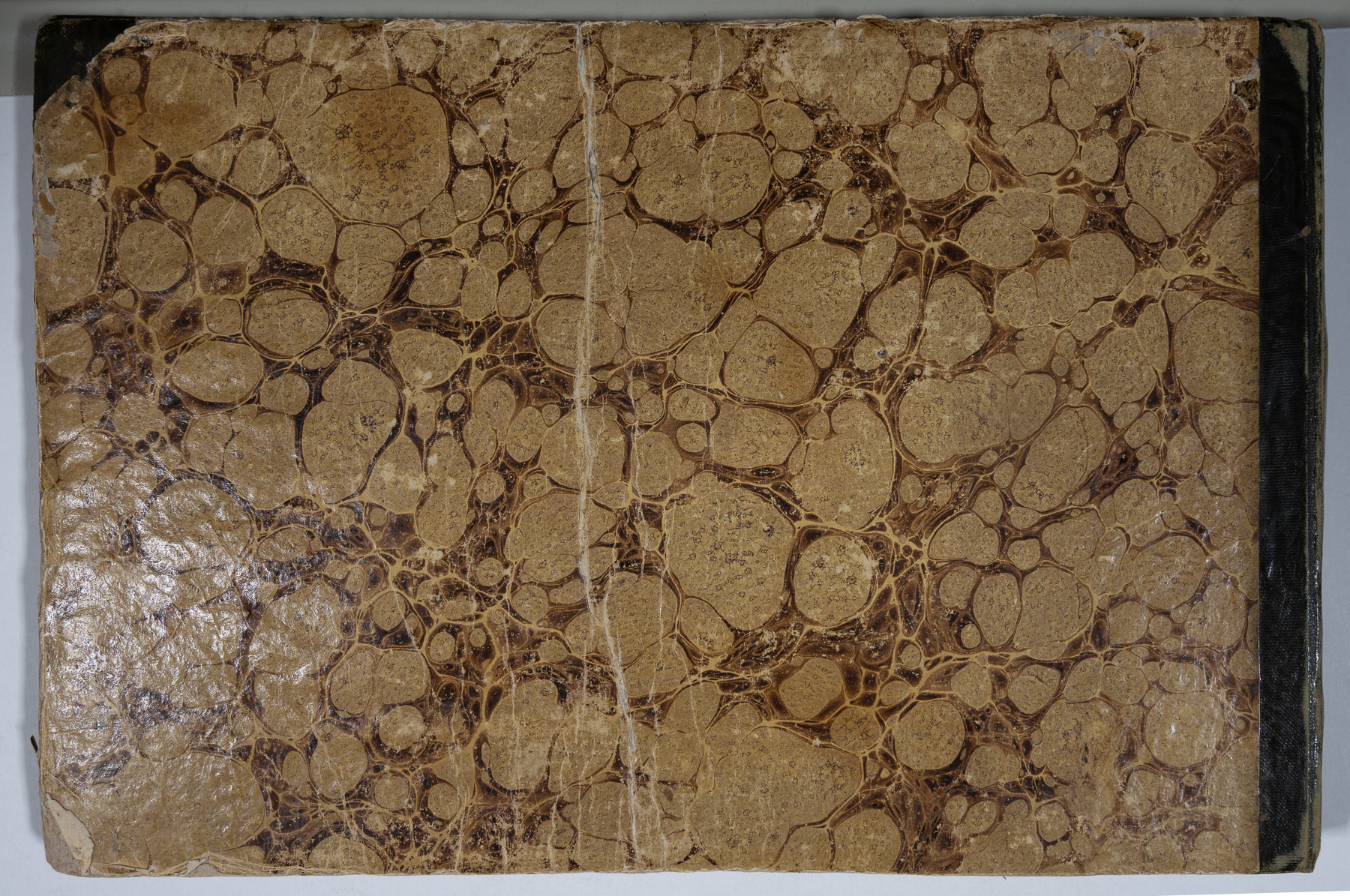 Einband: Karton, gelb-braun marmoriert, schwarzer Leinenrücken mit Goldprägung