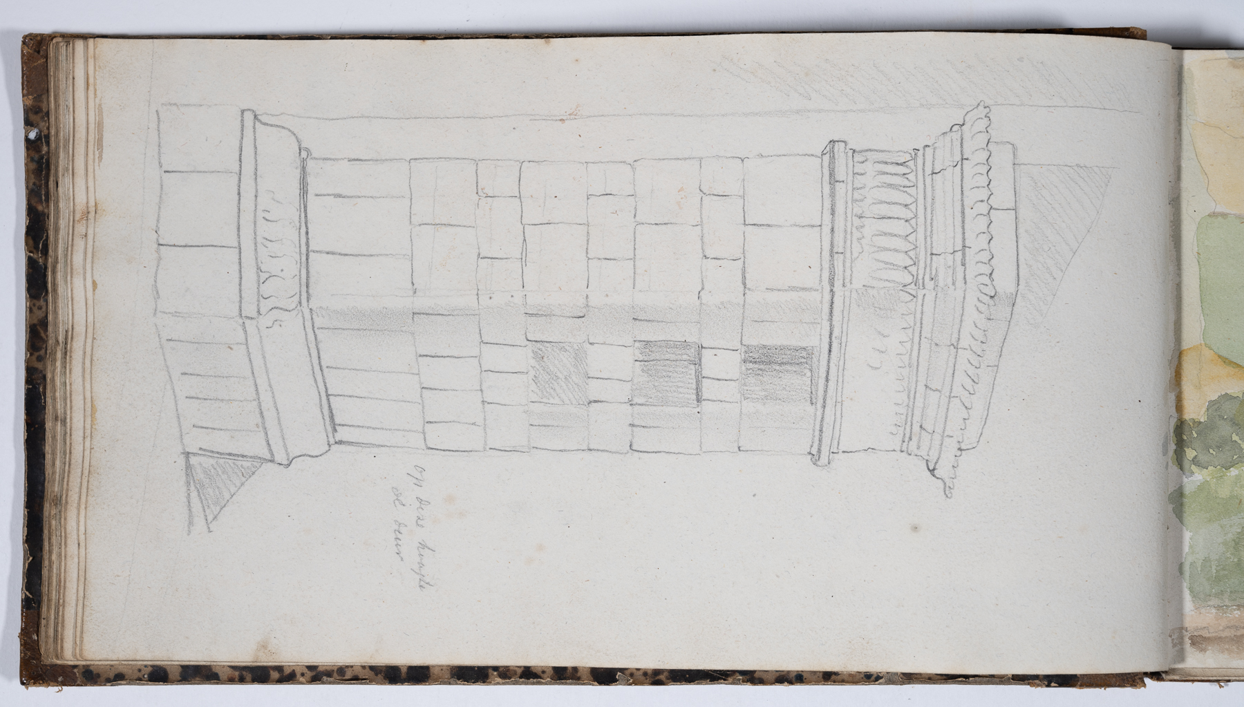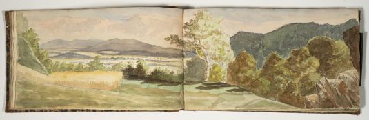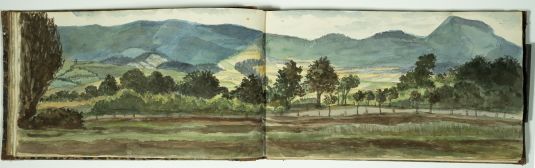 Das Skizzenbuch beginnt mit zwei Zeichnungen vom Rhein: Emmerich und das Siebengebirge bei Bonn. Dann beginnt die Reise in Schlesien: Die Wanderung geht von Reichenstein in der Oberlausitz und Weißwasser entlang der Reichensteiner Berge, weiter nach Niederschlesien. Das Skizzenbuch enthält viele Landschaftspanoramen der dortigen Berge. (Strehlener Berge, Eulengebirge etc.) Im hinteren Teil des Skizzenbuches sind in Bleistift einige Burgruinen am Rhein skizziert.