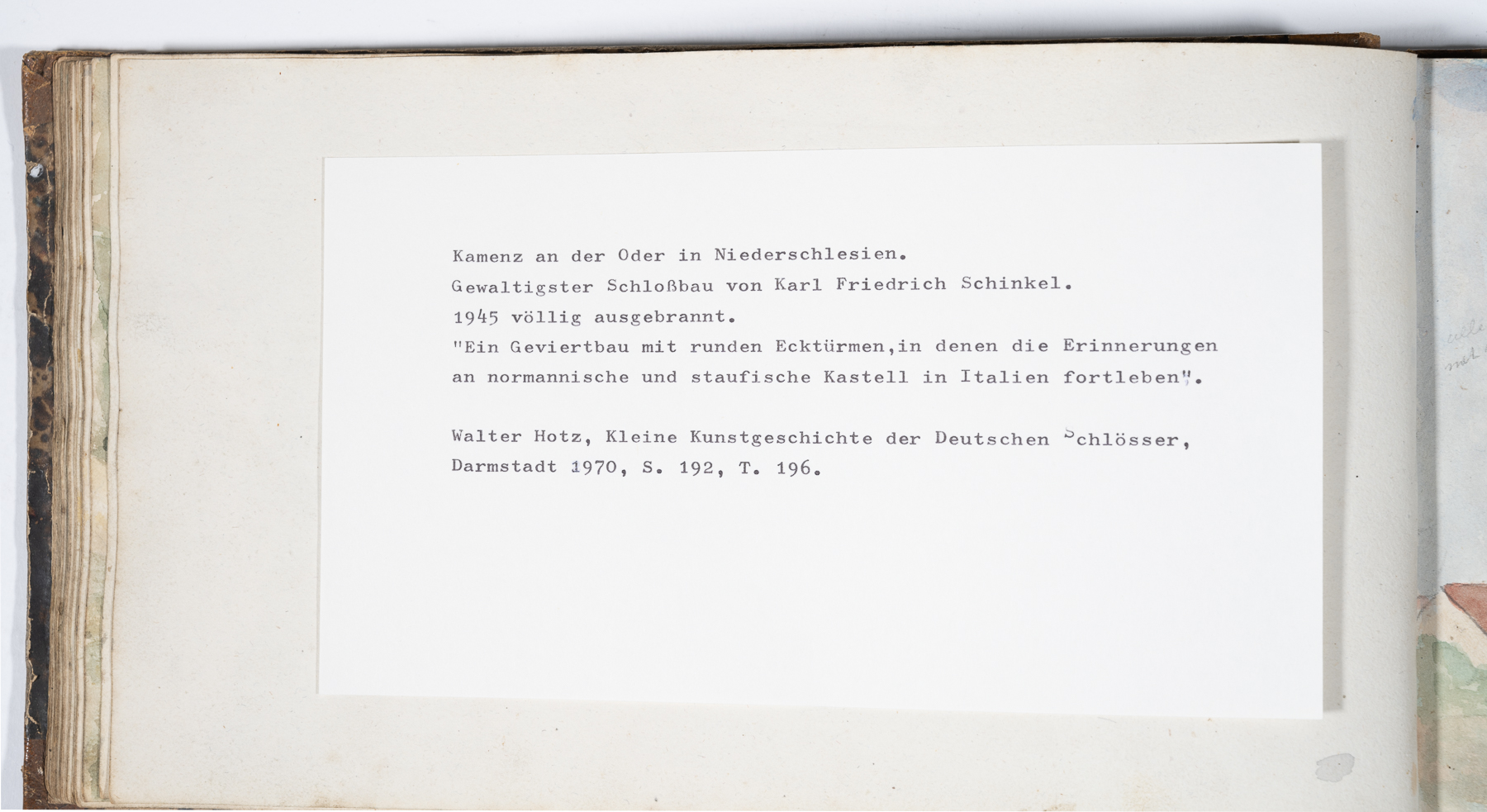 Das umfangreiche Skizzenbuch stammt von einem nicht professionellen Zeichner oder Zeichnerin. Leider gibt es keinen Hinweis auf die Identität des Künstlers. Auffällig ist, dass es vor allem genaue Studien aus der Umgebung von Kloster und Schloss Kamenz in Niederschlesien zeigt (Heute Kamieniec Ząbowicki in Polen).