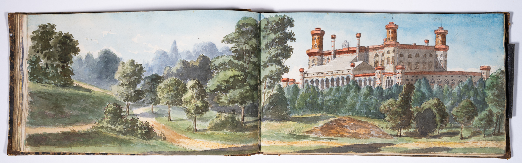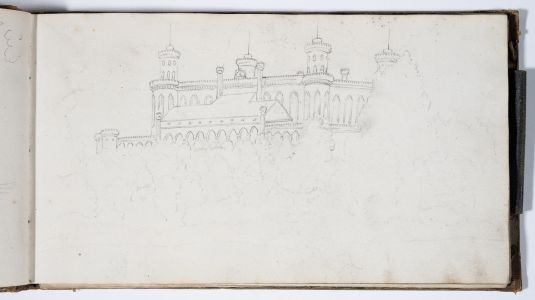 Das Skizzenbuch beginnt mit zwei Zeichnungen vom Rhein: Emmerich und das Siebengebirge bei Bonn. Dann beginnt die Reise in Schlesien: Die Wanderung geht von Reichenstein in der Oberlausitz und Weißwasser entlang der Reichensteiner Berge, weiter nach Niederschlesien. Das Skizzenbuch enthält viele Landschaftspanoramen der dortigen Berge. (Strehlener Berge, Eulengebirge etc.) Im hinteren Teil des Skizzenbuches sind in Bleistift einige Burgruinen am Rhein skizziert.