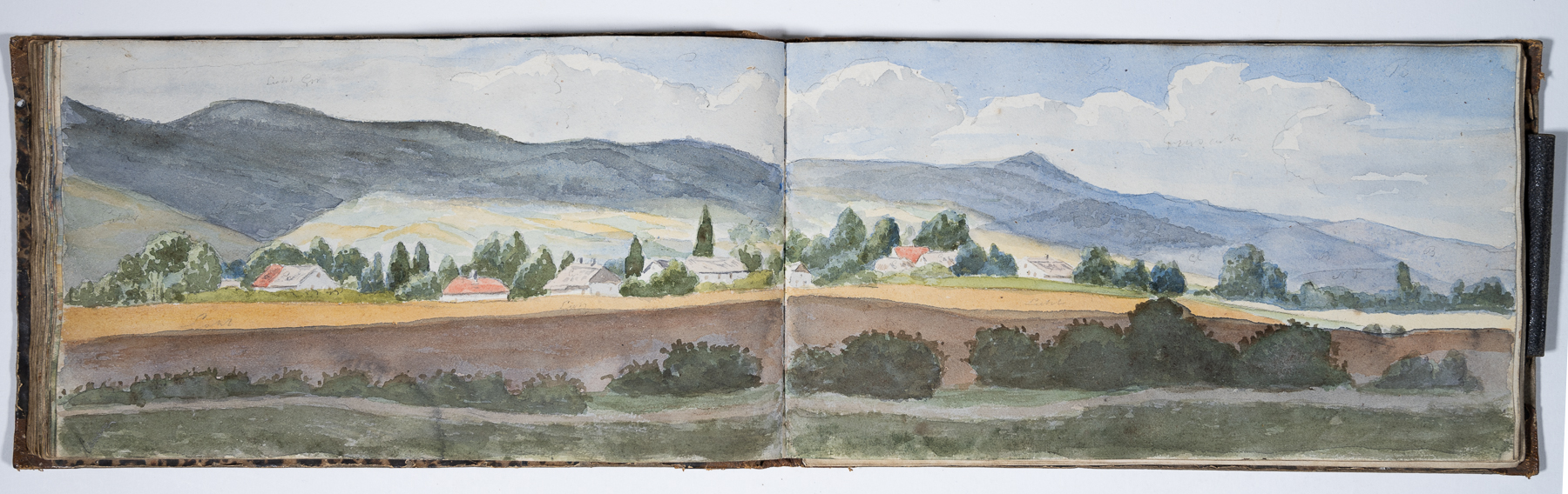 Das Skizzenbuch beginnt mit zwei Zeichnungen vom Rhein: Emmerich und das Siebengebirge bei Bonn. Dann beginnt die Reise in Schlesien: Die Wanderung geht von Reichenstein in der Oberlausitz und Weißwasser entlang der Reichensteiner Berge, weiter nach Niederschlesien. Das Skizzenbuch enthält viele Landschaftspanoramen der dortigen Berge. (Strehlener Berge, Eulengebirge etc.) Im hinteren Teil des Skizzenbuches sind in Bleistift einige Burgruinen am Rhein skizziert.