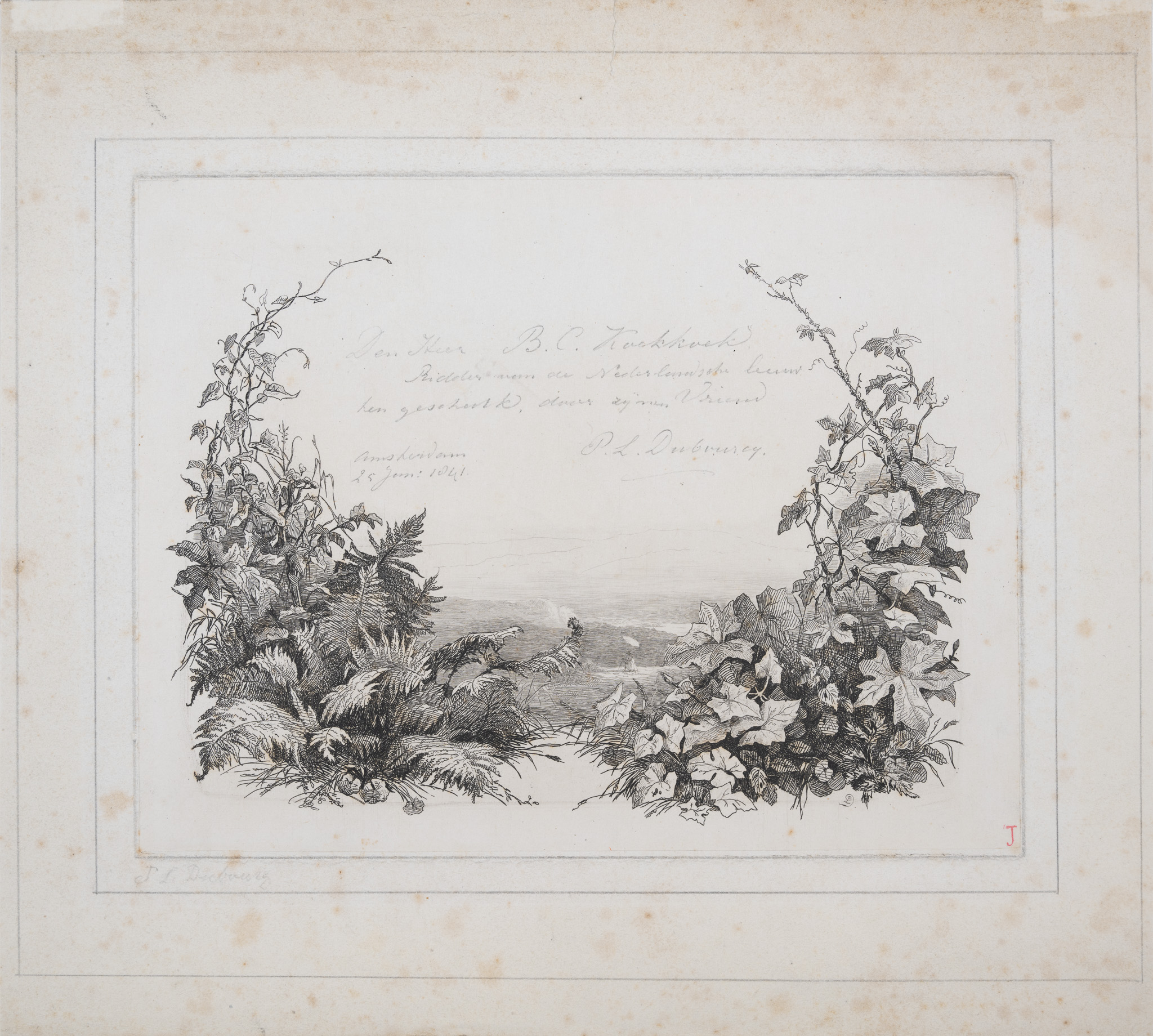 Aus Familiennachlass Koekkoek-Issleiber stammt eine Radierung mit handschriftlicher Widmung Pierre Louis Dubourcqs: „Den Heer B.C. Koekkoek Ridder van de Nederlandsche Leeuw te geschenk, door zijne vriend P.L. Dubourcq, Amsterdam 25 Juni 1841“. (Dem Herrn B.C. Koekkoek, Ritter des Ordens vom Niederländischen Löwen zum Geschenk, durch seinen Freund P.L. Dubourcq).