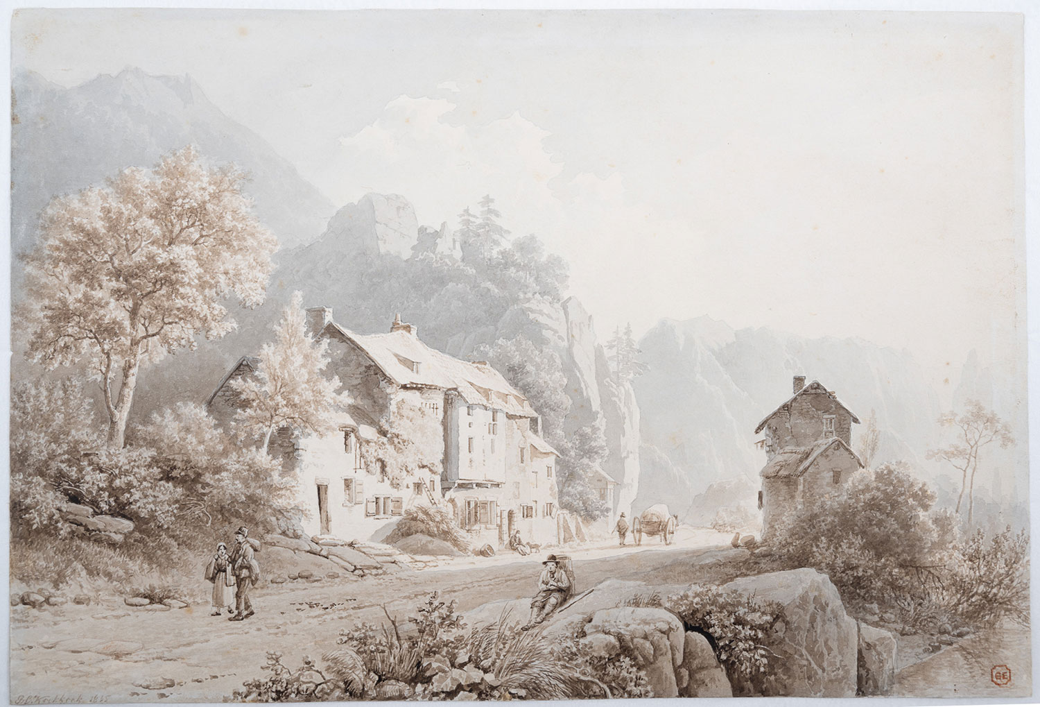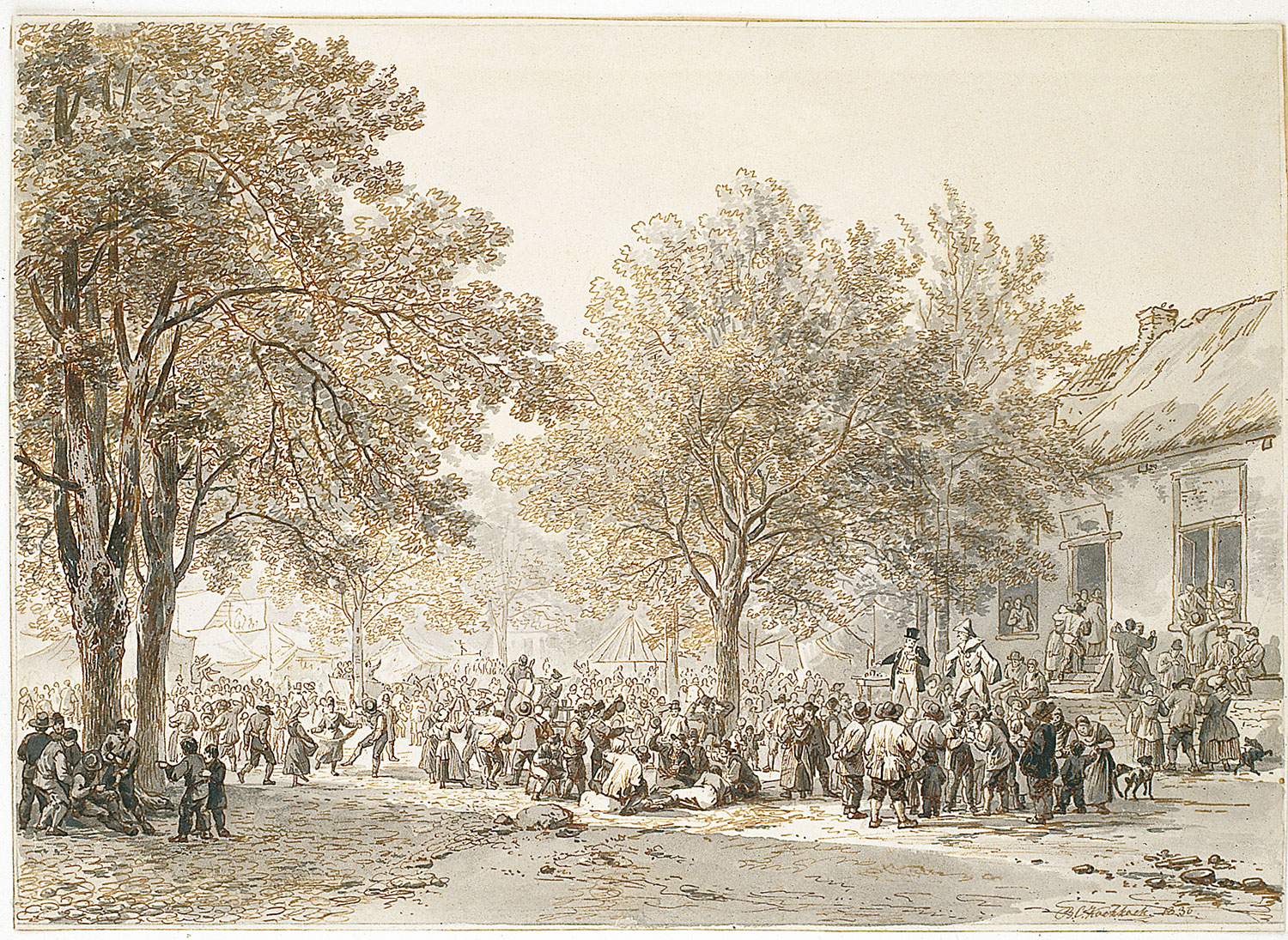 Aquarelle können farbig angelegt sein, seit 1830 verwendet Koekkoek meist braune und schwarze Sepiatöne. Trotz der scheinbaren Beschränkung auf diese beiden Grundtöne, schafft er es meisterhaft die perfekte Illusion von Licht und Schatten, Nähe und Ferne herzustellen. In den kommenden Jahren vervollkommnet er sich in dieser Kunst. Es entstehen Landschaften, aber auch Genreszenen aus dem Leben der Landbevölkerung (Dorffest, Viehmarkt, Kegelspiel, Jagd, Militär, Schützen, Räuber, Savoiarden - fahrende Gaukler und Händler).