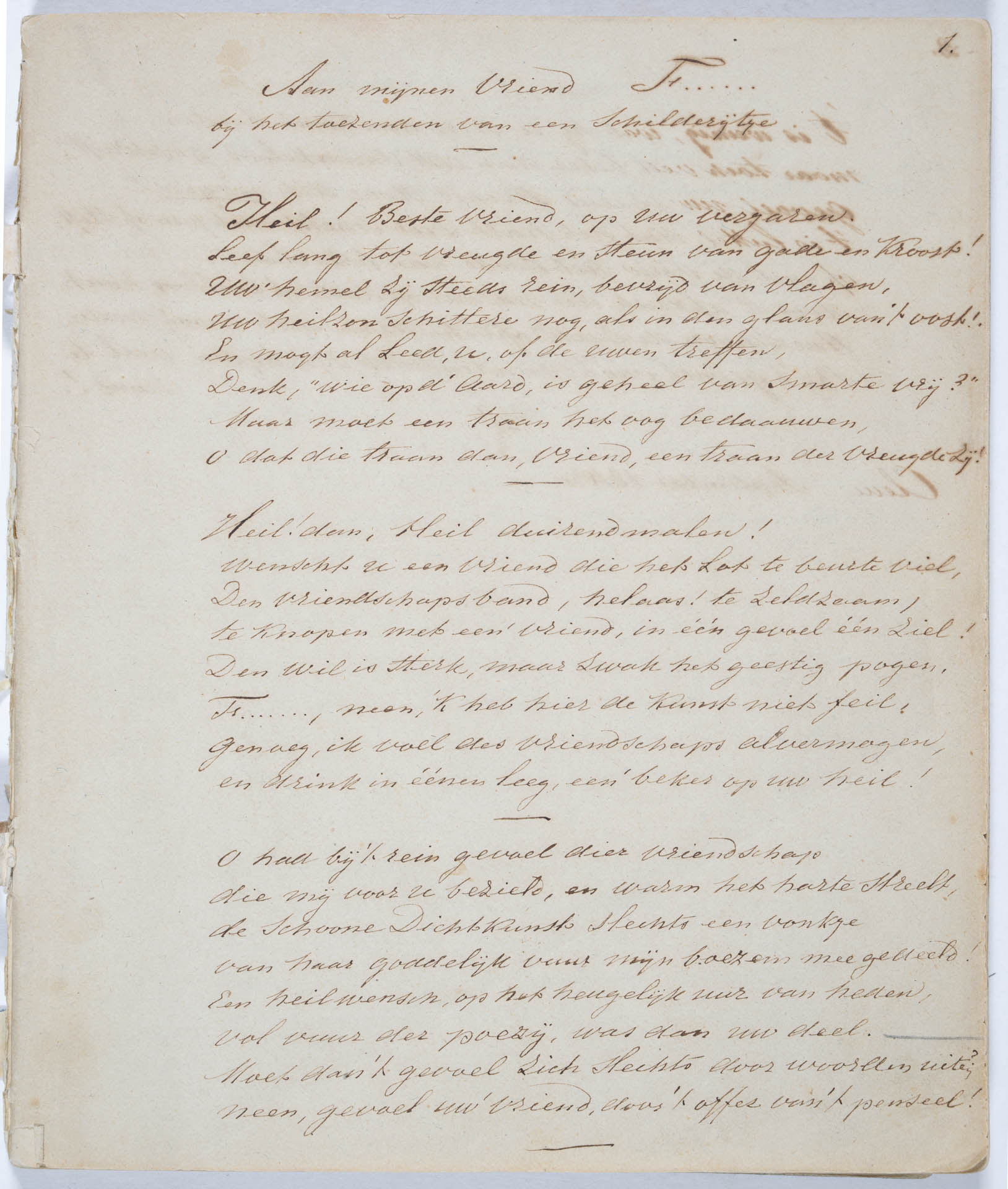Der Autor rät dem Künstler, die heimatliche Landschaft stärker zu berücksichtigen: „Sicher, unser Vaterland weist keine Felsen, Wasserfälle, hohe Berge und romantische Täler auf. Eine stolze, erhabene Natur ist in unserem Land nicht zu finden; und doch bietet dasselbe uns Naturschönheiten an, die in vielen anderen Ländern nur selten vorkommen: schöne, viel- und feinfarbige Dünen und Hügelgruppen, malerische und lebendige Flüsse, schwere Bäume und Bewaldung; denkt an den Haager Wald, das Haarlemer und Alkmaarer Holz usw. Fröhliche Hügellandschaften, so ein Teil von Utrecht, Gelderland und Noord-Brabant; schließlich einige schöne Fernsichten und Teiche.“