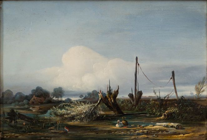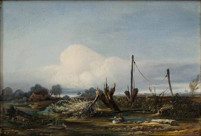 Flusslandschaft. Im Vordergrund ein Pfuhl mit Baumstumpen, Treibgut und zwei Enten; links ein Kinderspielboot mit Holländischer Fahne; im Hintergrund links ein Bauernhof zwischen Bäumen.