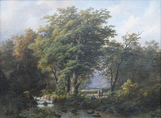 Waldlandschaft an Bachlauf. Ein Jäger mit Gewehr sitzend am Wasser. Ein zweiter Jäger im Gespräch mit einer Frau auf dem Weg. Im Hintergrund die Silhouette eines Dorfes.