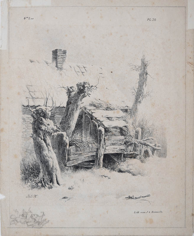 Landschaftsstudien: Bauernkate im Schnee; aus "Landschap Studien" Ausgabe Koekkoek / Daiwaille 4. Lev. Pl. 20 (Inv.nr. 0870); nach B.C. Koekkoek und von ihm selbst mit Bleistift umrahmt, in der Ecke linksunten Pflanzen in schwarzer Kreide.