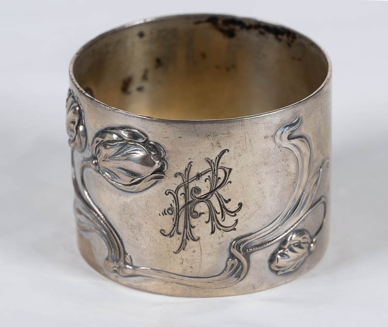 Breiter runder Ring mit Jugendstilornamenten im Relief: Tulpenblüten und -blätter um graviertes Monogramm RK (oder KR).