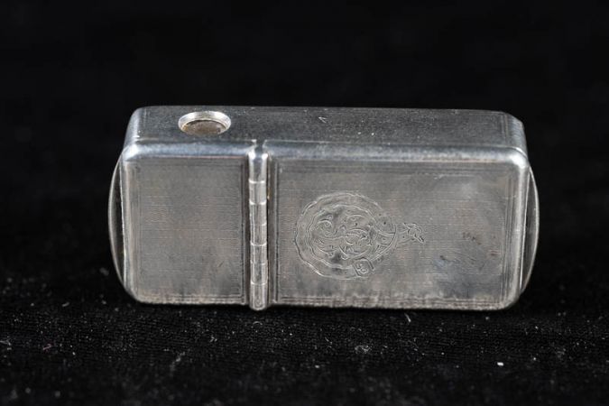 Dose in zwei Abteilungen verteilt, beide mit Deckel: eine Hälfte für Hölzchen, die andere zum Anzünden; auf dem größten Deckel ein von einem Gürtel eingefasstes Monogramm EB (?).