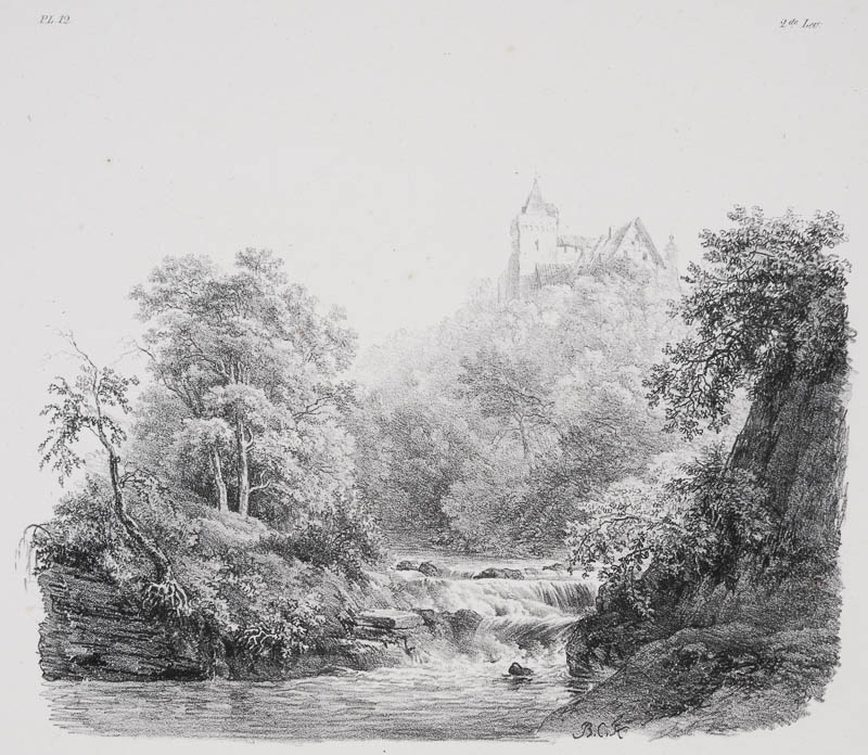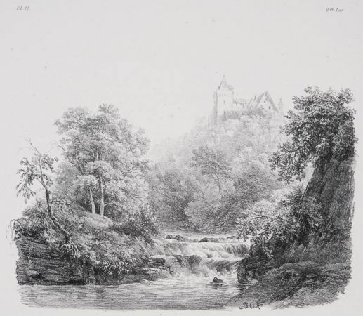 Landschaftsstudien / landschapstudies; Kleiner Wasserfall unterhalb einer Burg; Blatt 12 von 59 Lithographien.