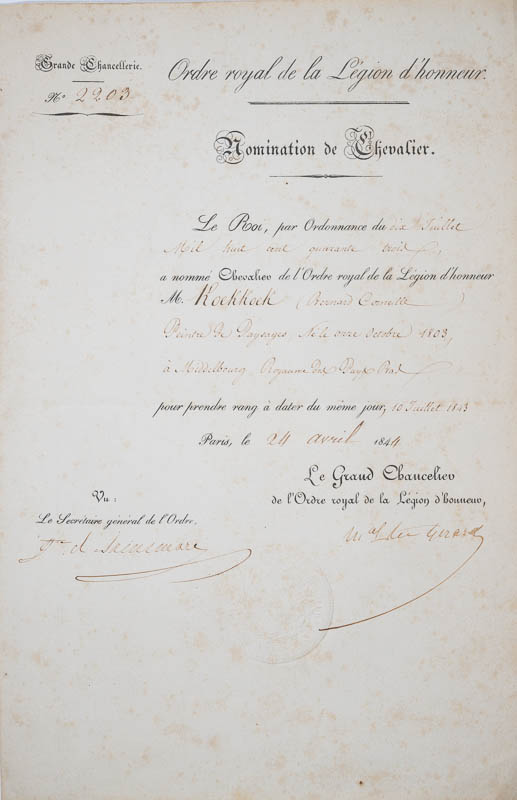 Verleihung des französischen Verdienstordens: Royal Order of the Legion of Honour 24. April 1844; Der Orden wurde am 19. Mai 1802 von Napoleon Bonaparte, damals noch Erster Konsul, in der Absicht gestiftet, militärische und zivile Verdienste, ausgezeichnete Talente und große Tugenden zu belohnen.