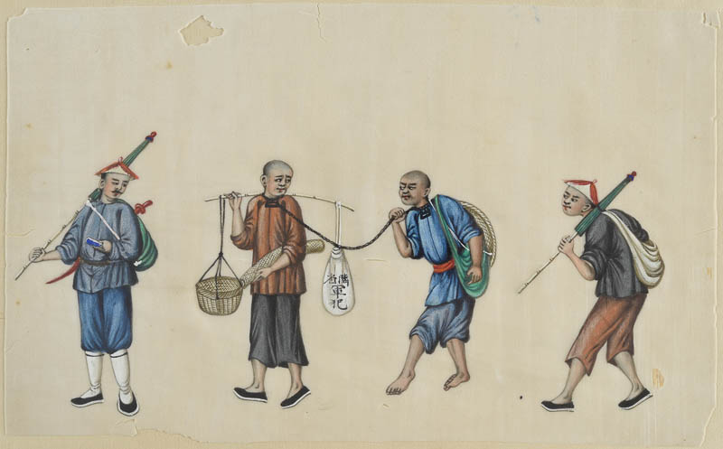 Vier Chinesen: links und rechts laufende Figuren mit Schirm und Schwert; in der Mitte zwei Gefangene oder Sklaven.