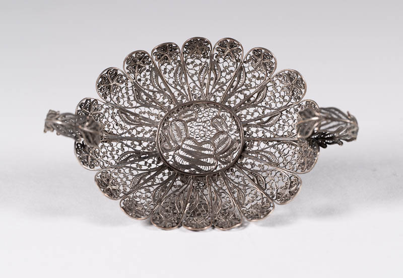 Filigran Schälchen mit zwei Ohren, sehr feine Arbeit; flache Schale aus 18 zungenförmigen Feldern, worin jeweils eine Blume; in der Mitte florales Motiv; zwei runde Ohren aus Filigranblättern; kleiner hoher Fuß.