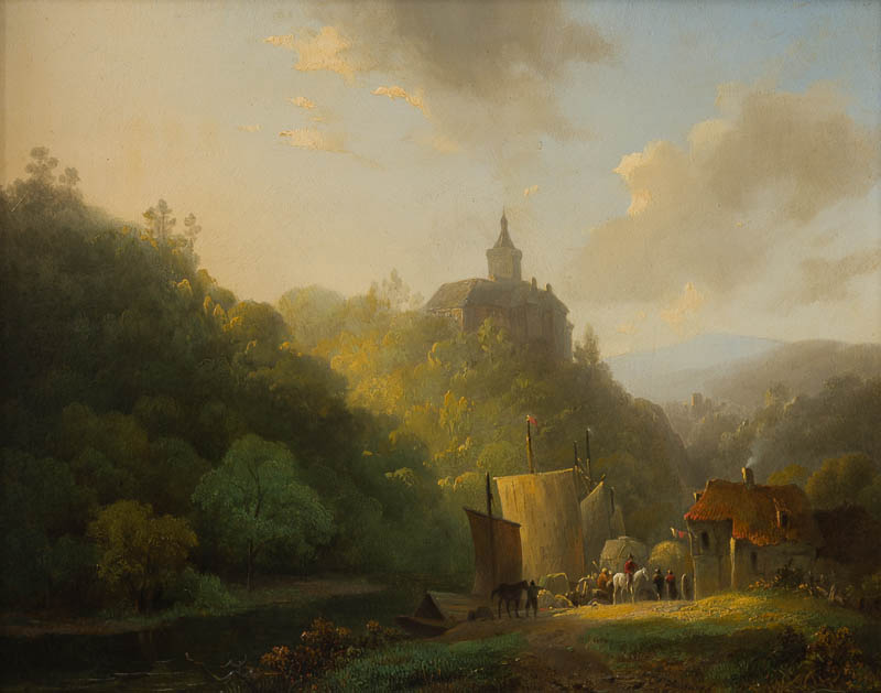 Die Schwanenburg; Im Vordergrund rechts ein Haus am Fluß, darauf ein Schiff mit Reisenden; dahinter steigt aus einer sehr waldreichen Umgebung der Hügel mit der Schwanenburg auf; das Ganze wird von hellem Sonnenlicht überflutet.