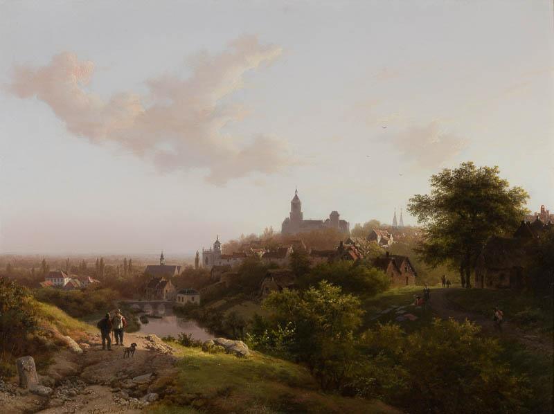 Blick auf Kleve vom Spoykanal aus. Topografische Situation als Fantasiestück verändert. Der Atelierturm Belvedere ist zwischen Burg und Unterstadt zu sehen.