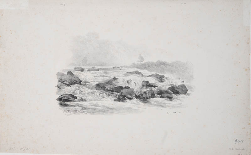 Landschaftsstudien: schnell fließender Fluss mit Wasserfällen; aus "Landschap Studien" Ausg. Koekkoek/Daiwaille 6. Lev. Pl. 33 (Inv.nr. 0909); nach B.C. Koekkoek.