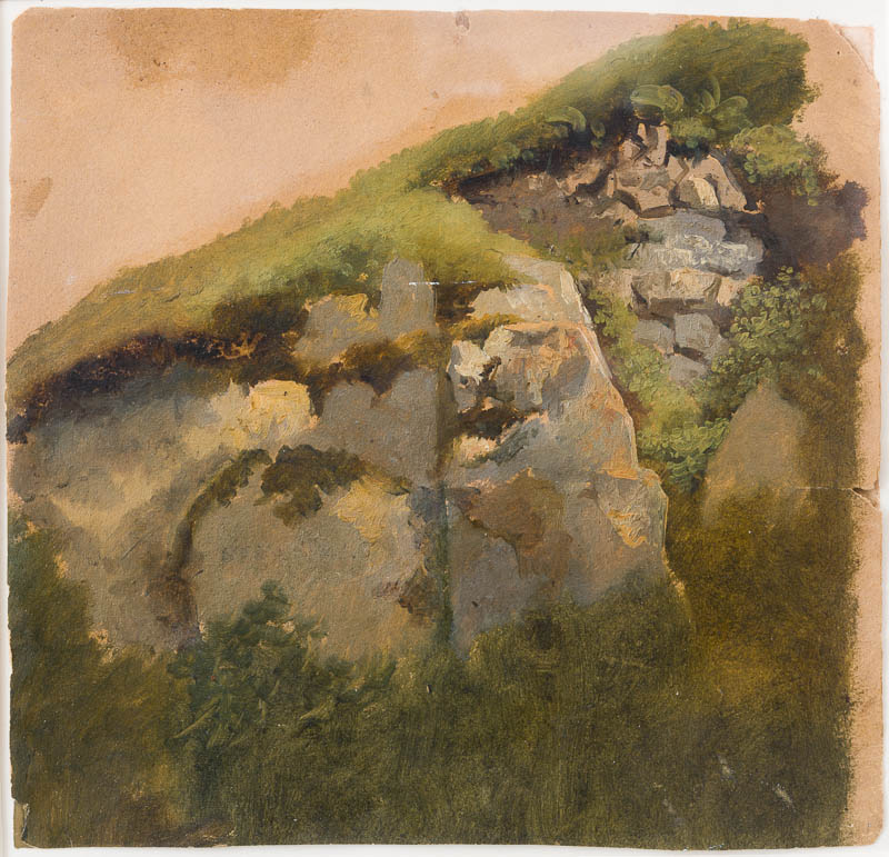Detaillierte Studie einer mit Moos, Gras, Gestrüpp bewachsenen Felsformation, nicht grundiert.