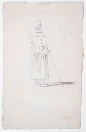Skizze einer Frau mit Haube und Stock in Rückenansicht.