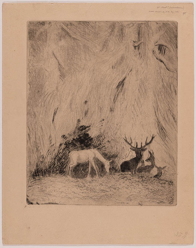 Hirsche in einem böhmischen Wald. Bezeichnet: Herten in een Boheems woud