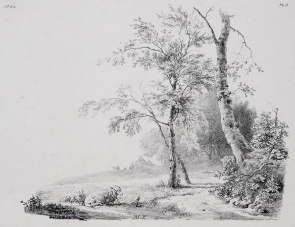 Landschaftsstudien / landschapstudies; Schaf und Birken; Blatt 5 von 59 Lithographien.