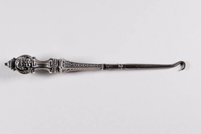Garniturteil; Knopfhaken mit sechseckigem Griff mit Reliefdekor.