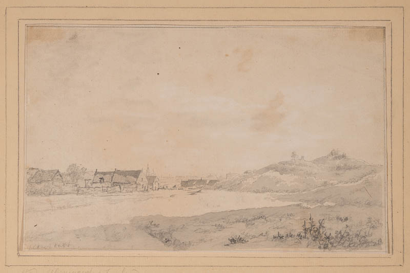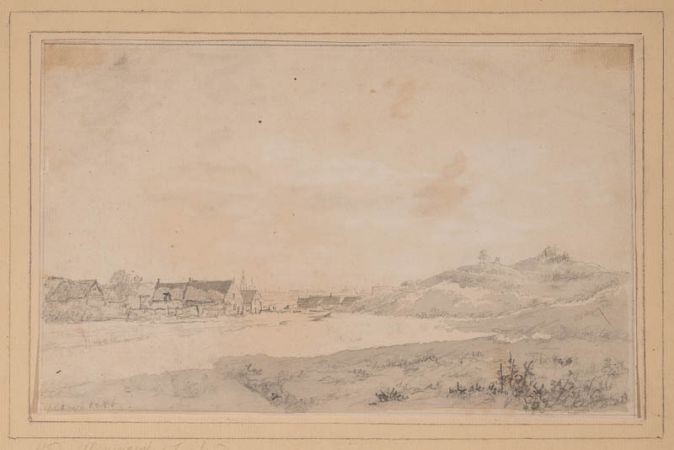 Blick auf Vlissingen von den Dünen aus; im Vordergrund Fischerhütten, am Horizont die Silhouette der Stadt mit Turm der St. Jacobskirche.