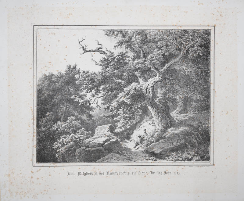Wald- und Felsenlandschaft mit zwei Künstlern, die vor einen großen Baum sitzen und zeichnen; erste Jahresgabe des Klever Kunstvereins 1843.