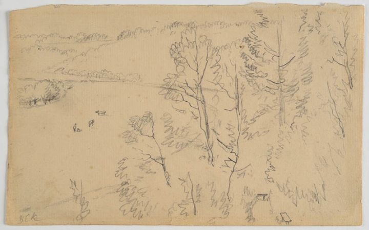 Skizzenbuchblatt: bewaldeter Hügelrand bei Valkenburg (?).