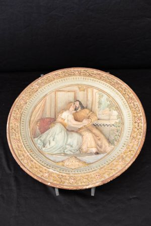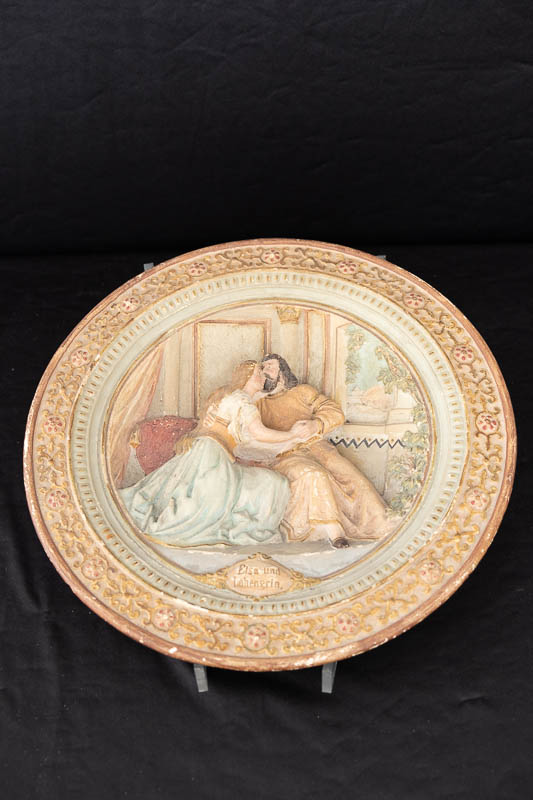 Zierteller mit einer Liebesszene mit "Lohengrin und Elsa" in Reliefrund, Außenrand mit Ornament.
