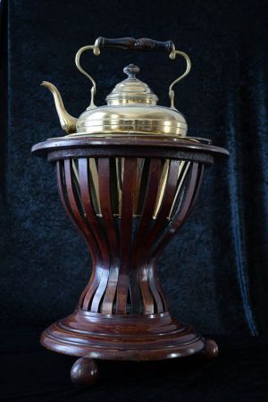 Teekomfort in Mahagoni, massiv mit Bandeinlagen in Ahorn; Wasserkessel, Rechaud und Eimer aus Messing.