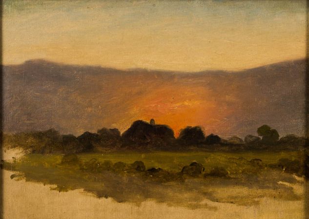 Landschaftsstudie mit Sonnenuntergang hinter einem Bauernhof.