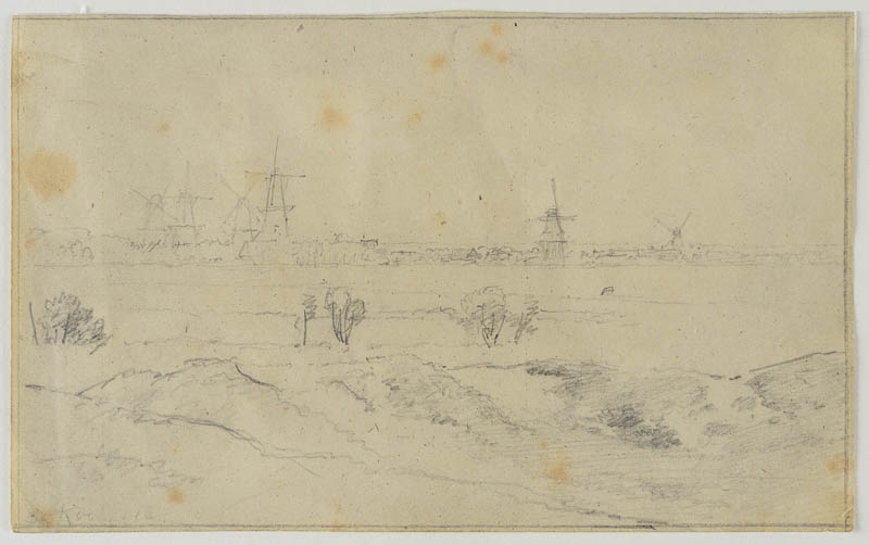 Skizzenbuchblatt: Holländische Landschaft mit Mühlen.