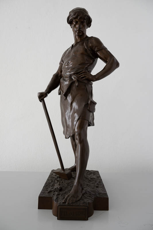 Bronzefigur "Pax et Labor"; Mann stehend, die linke Hand auf der Hüfte, in der rechten Hand einen Hammer; 1897 anlässlich des Ehepaares Mentrop Esser.