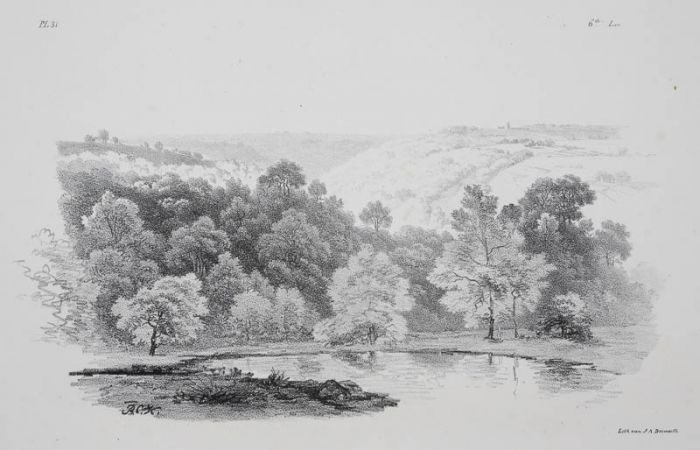 Landschaftsstudien / landschapstudies; Hügellandschaft mit Bäumen und Teich im Vordergrund; 30. Blatt von 59 Lithografien.