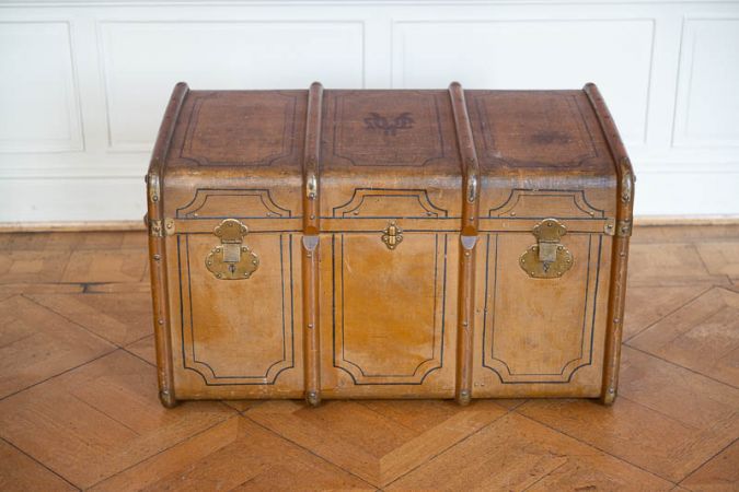 Reisekoffer; Holzkoffer mit braun bemalter Leinwand bezogen, durch Holzrippen verstärkt; innen zwei stoffbespannte Laden zum herausheben; Anfang 20. Jh.