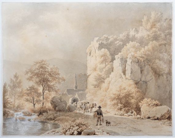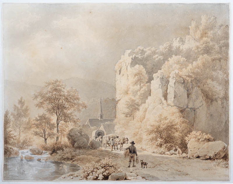 Einzug ins Dorf; Landweg mit links Bach; rechts hoher Felsen. Dahinter Durchblick auf Bauernhof und Dorfkirche. Auf dem Weg zwei Wagen und ein von hinten zu sehender Mann mit Hund. Rechts zwei sitzende Figuren.