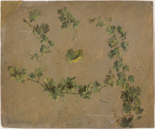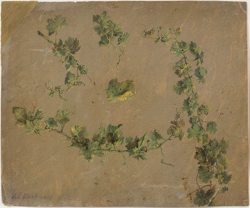 Detaillierte Studie von mehreren Weinreben mit Laub und einzelnen Weinblättern auf heller Grundierung.