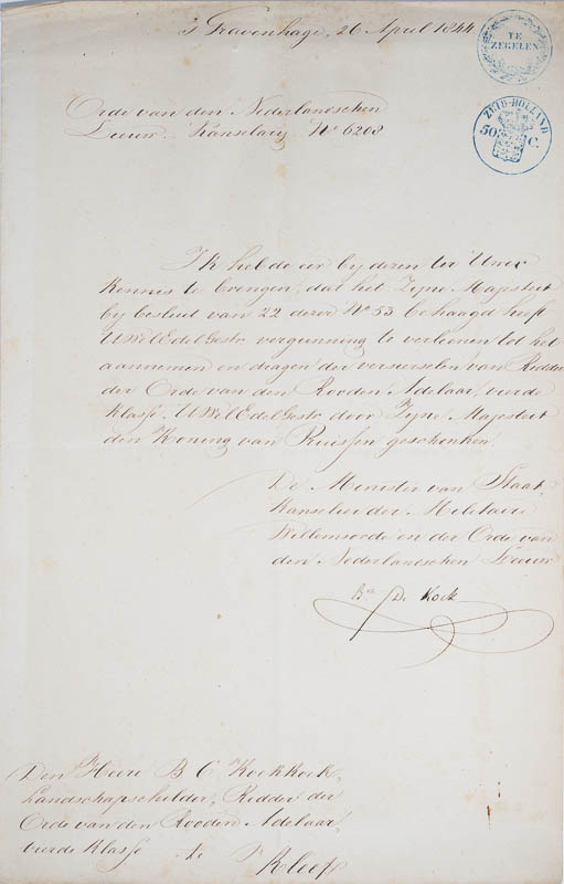Ernennung zum Ritter des Ordens "Rooden Adelaar, 4. Klasse" am 26. April 1844, vom König von Preußen verliehener Orden.