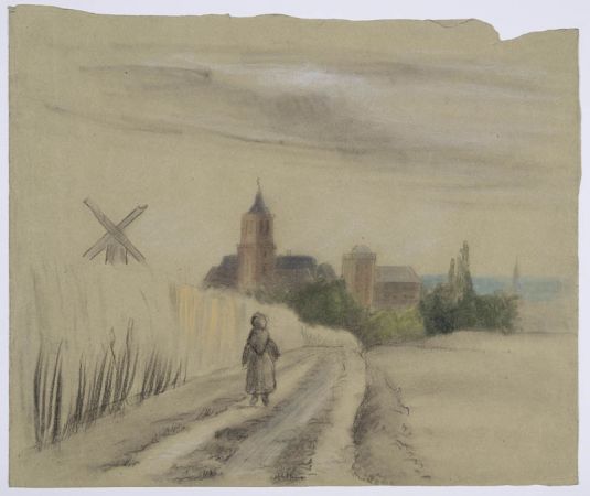 Blick vom Klever Berg auf die Schwanenburg im Hintergrund; eine Frau läuft auf einem Weg in Richtung der Burg.