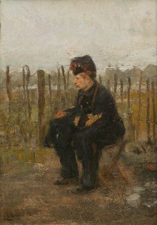 Soldat, sitzend auf Hocker vor Palisaden.