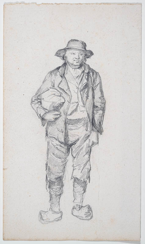 Junger Mann mit Hut und Holzschuhen, mit Bündel unter dem rechten Arm.